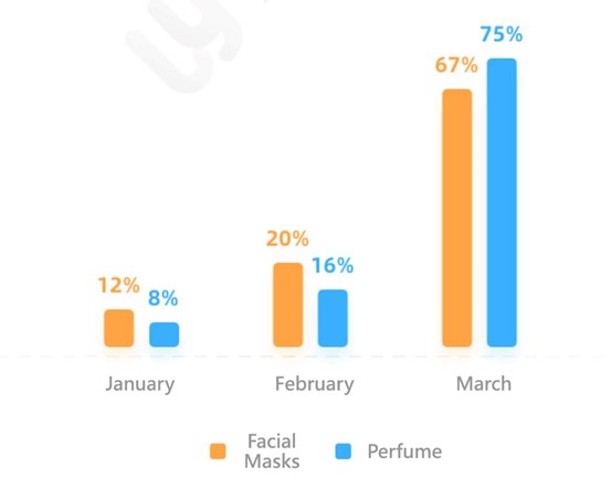 Skincare is an evergreen, when it comes to live commerce in China. We’re talking SPFs, moisturizers, cleansers and, in a big way, facial masks. The most interesting point in the report on this topic is that skincare is growing in popularity among male users. The report notes a giant leap in demand for these products in March, but does not proffer any possible causes of this leap.