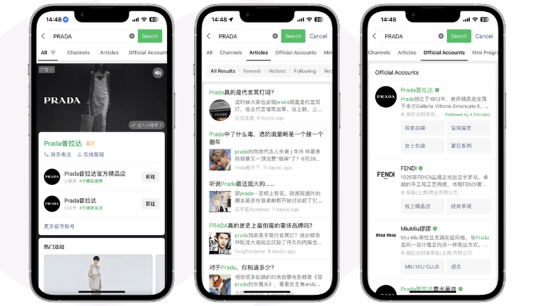 Users searching for articles, news, and other content published on WeChat can use the app’s filtered search to get the results they’re trying to find. Because of this, brands must optimize their content with relevant keywords and ensure they appear in a specific search result.