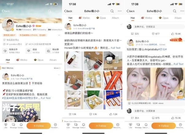 桃小小 (Tao Xiaoxiao) holds a notable position as Beauty KOL in China. With an impressive following of 11.9 million on SinaWeibo, she has emerged as a key influencer in the Korean-style movement, setting trends and introducing new looks through her makeup expertise.