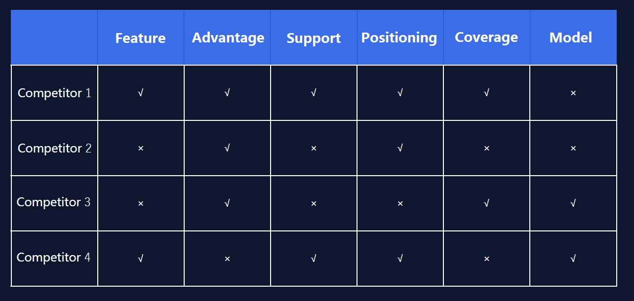 - Together with different key elements (Namely – Feature, advantage, support, positioning, coverage, model etc.) to quickly identify the advantages and weaknesses between competitors and our own product.