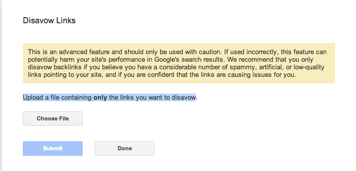 The same message will again be displayed, and will invit you to upload a .txt file (limited to 2Mb, 1 file / site) with all the links you want to disavow.