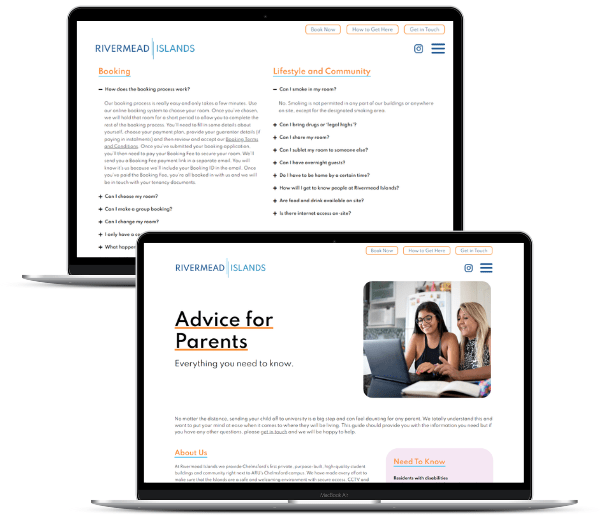 On top of developing a fully functioning website, we also integrated an Instagram feed, web form, call to action, and FAQs. For young students inquiring about Rivermead Islands, Instagram integration is extremely important, as is an FAQ section. Often, this will be the student’s first time moving away from home, and therefore they will have a lot of questions.