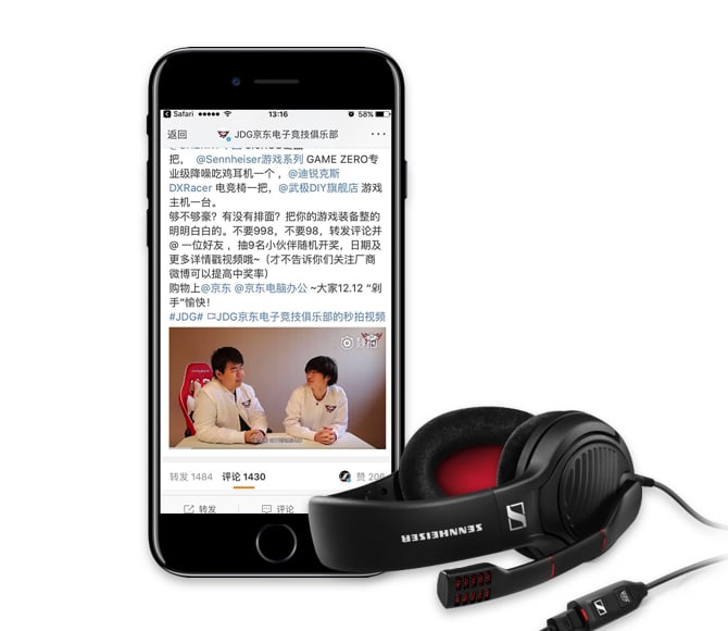 JD.com is a strong retailor for electronic products and represents many brands, including Sennheiser. In the realm of online gaming, JD.com satisfies gamers’ needs in one place. JDG (JD Gaming) was founded in 2017 and is dedicated to gamers, with the gaming team expanding rapidly in just one year. The current team plays DOTA, LOL, PUBG, OverWatch and other globally popular games. JDG has 50,000+ fans, whom are identified as Sennheiser Gaming potential customers. On 12/12, JDG teamed up with other brands complimentary to Sennheiser to create a lucky draw campaign. Sekkei proposed Sennheiser to partner with JDG by sponsoring a set of Sennheiser GAME ZERO headsets as one of the lucky draw prizes, and to produce a video about the hero product. The video published by JDG generated high number of views and brand awareness. The collaboration attracted a number of new followers who are highly relevant to the brand.
