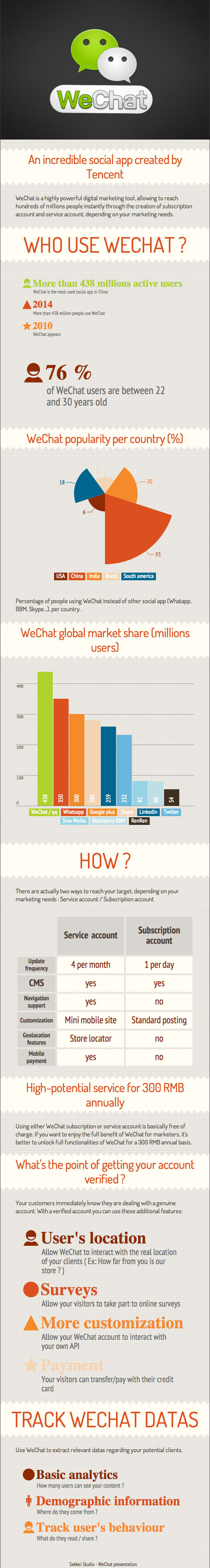 Whether you plan to post content every 2 months or weekly, you will have to decide which account perfectly fits your marketing needs. With WeChat, Tencent gives you the choice between two types of account, providing different features depending on what you really expect from the social app.